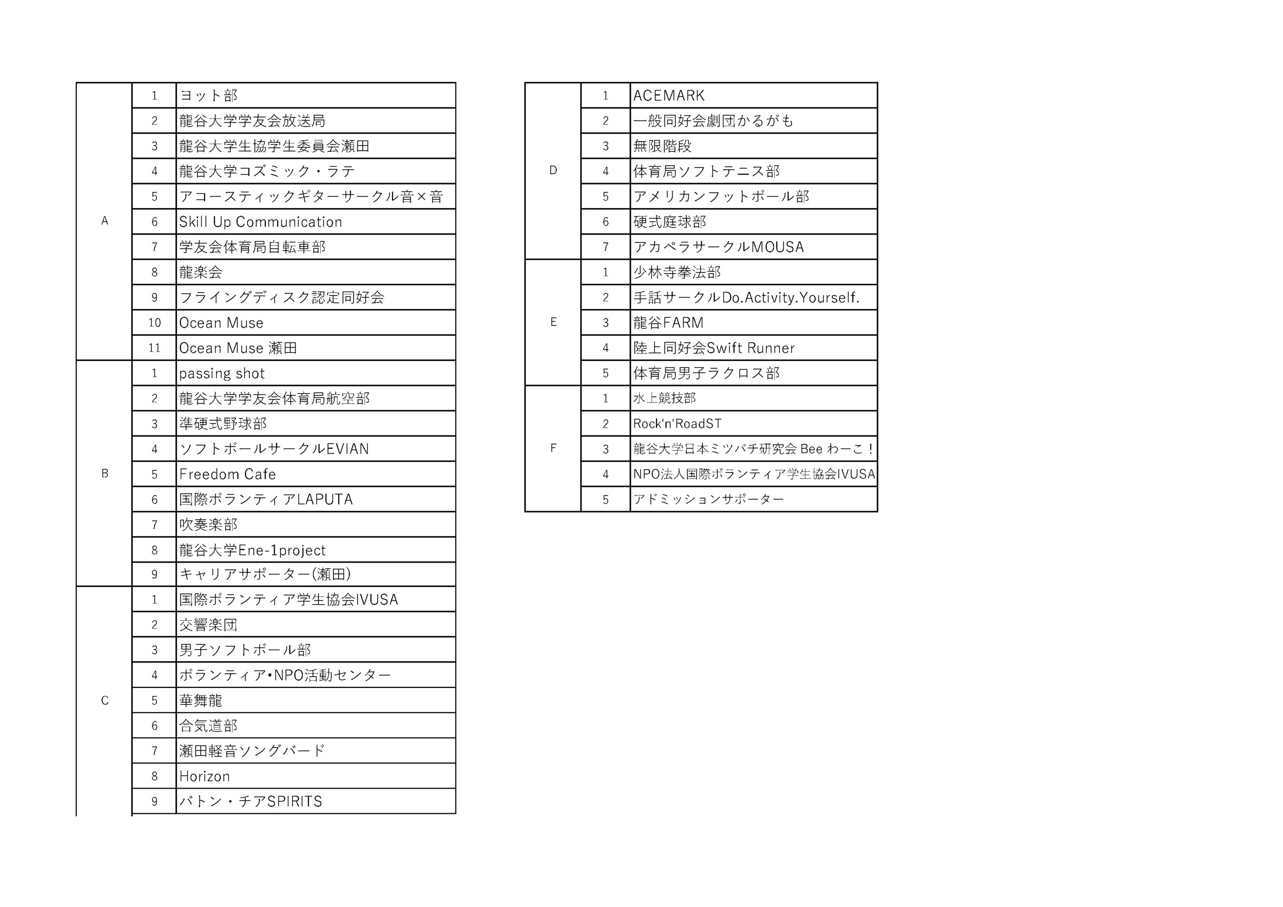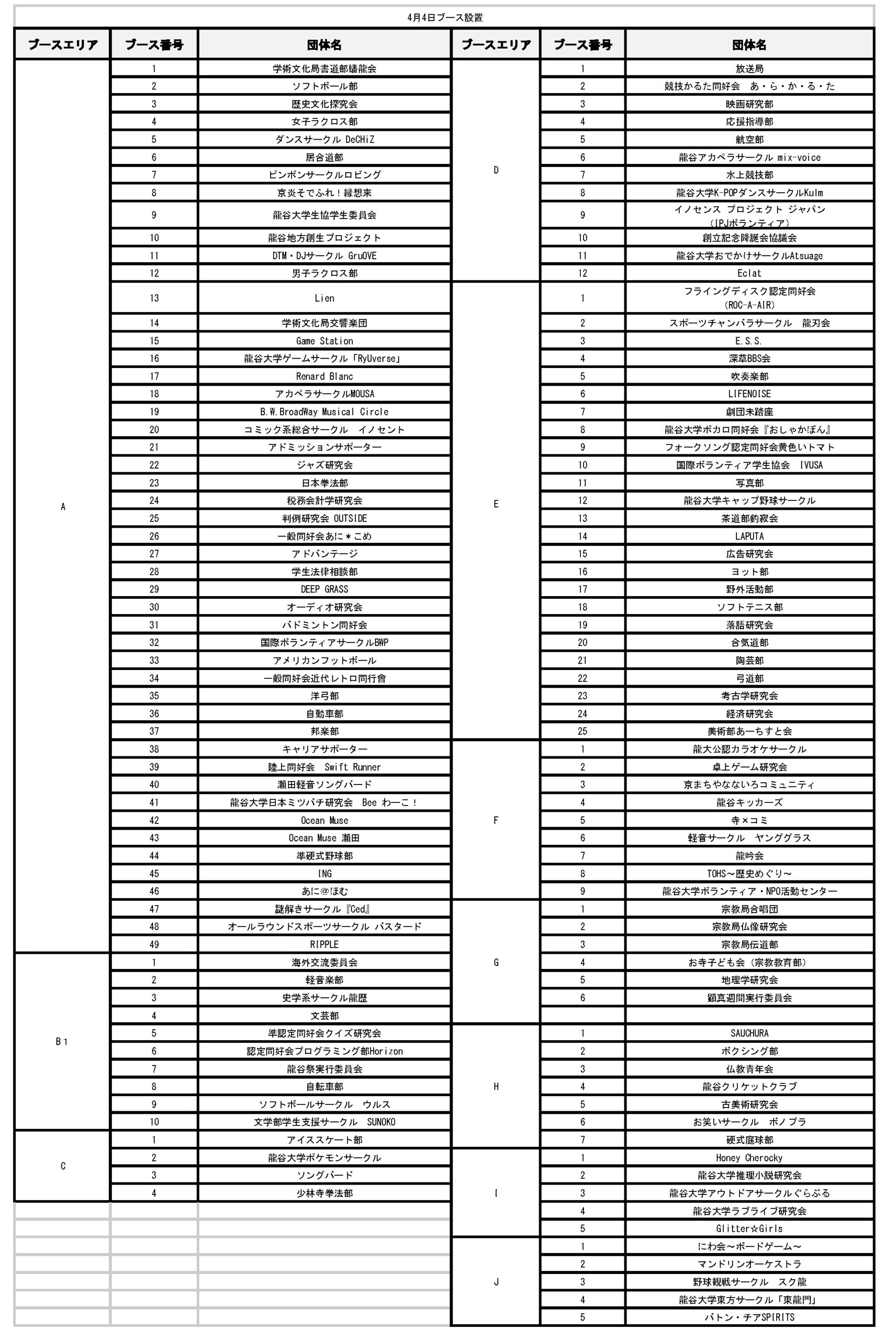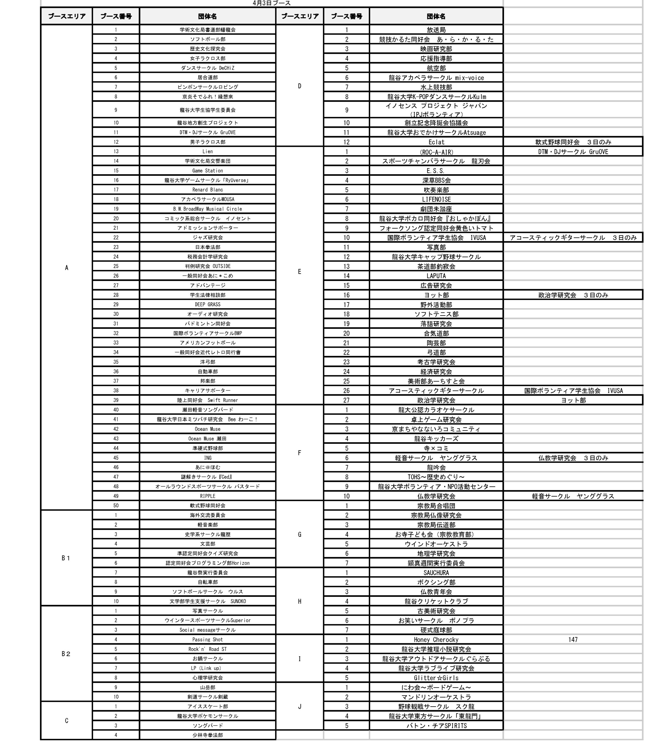 龍谷大学学友会は4月1日より新入生歓迎行事を開催致します。また、4月3日・4月4日には各団体によるブースが設置されます。入学式にて配布の新歓パンフレットと共に以下のブースマップ・ブースリストをご参照ください。新入生の皆様のご参加を心よりお待ちしております。